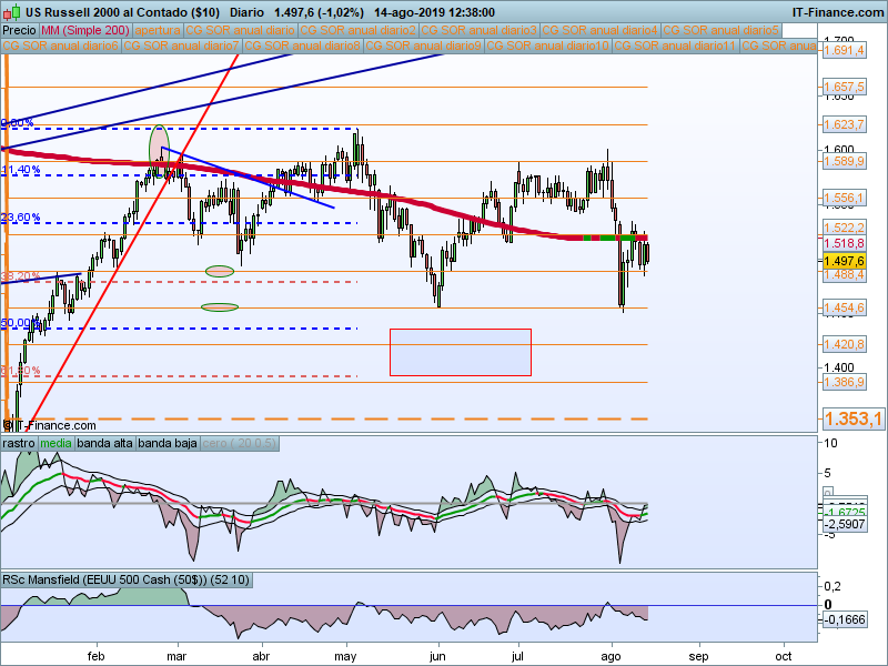 Nos mantenemos por debajo de la media de 200 y por tanto mantenemos la predisposición bajista, por debajo de los mínimos de agosto deberíamos pensar en 1387 SOR.