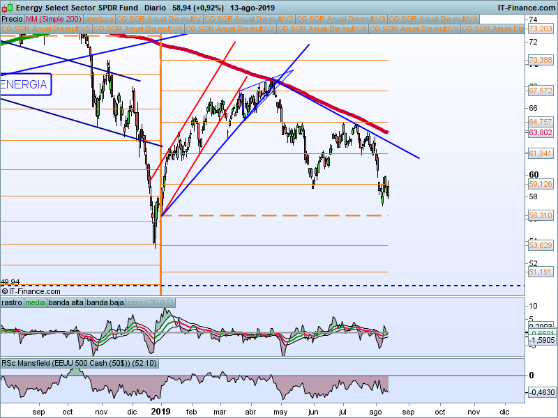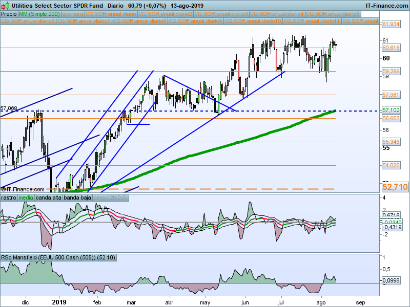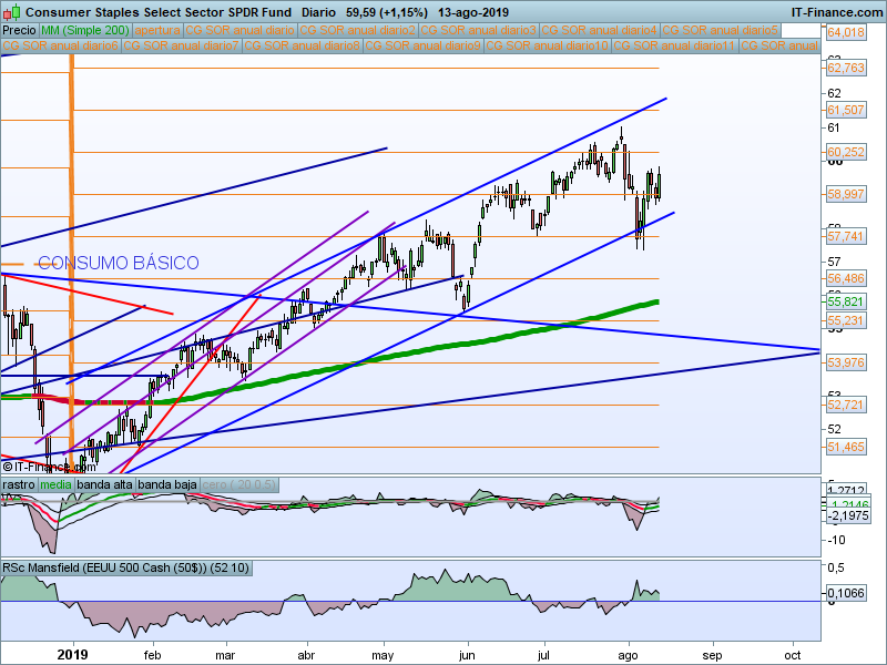 Se mantiene lateralizando en zona de máximos desde hace más de dos meses. Es uno de los sectores que mantienen más fuerza en este momento, lo cual es representativo del miedo que tenemos en el mercado. La zona de control es el SOR 59.30. Mientras estemos por encima mantendremos predisposición alcista.