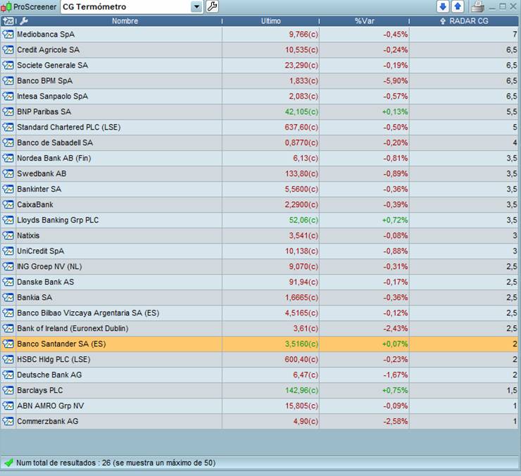 Bajo el filtro proporcionado por nuestro screener «CG Termómetro» obtenemos una valoración comprendida entre 0 y 10 en base a criterios de tendencia, fuerza y volatilidad entre otros. Los valores con mejor comportamiento tendrán una lectura próxima a 10, mientras que los de mayor debilidad tenderán a aproximarse a cero.