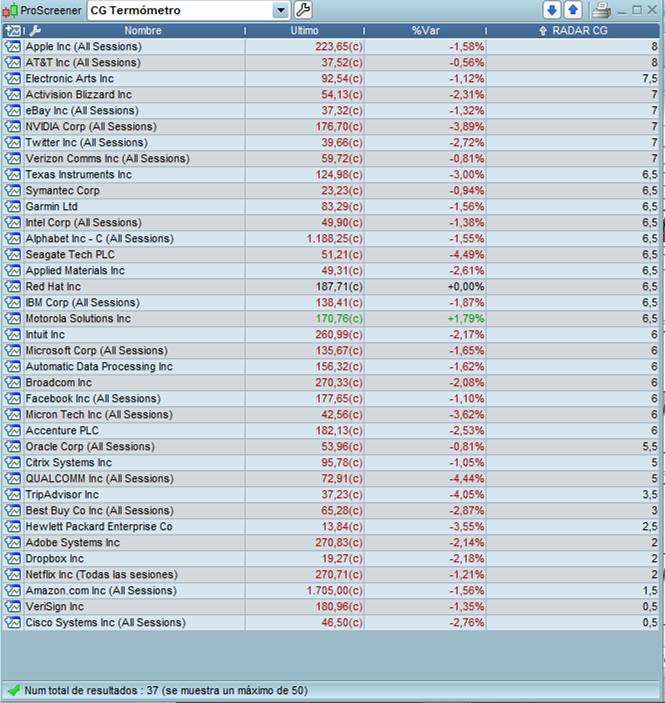 «CG Termómetro» es un screener o buscador programado especialmente para la plataforma gráfica ProReal Time y realiza una evaluación técnica tomando como referencia indicadores tendenciales, de momento así como de volatilidad. El indicador ordena de 0 a 10 el aspecto técnico de cada activo. Antes de tomar cualquier decisión respecto a los valores aquí señalados, recomendamos revisar la estructura del precio y la situación de la cotización respecto a zonas de soporte o resistencia relevantes.