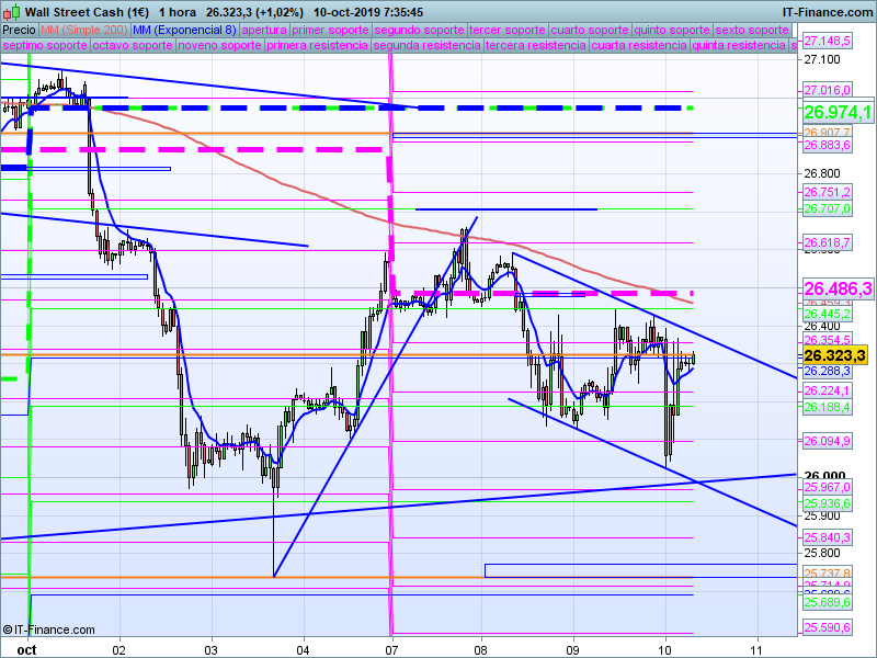 A muy corto plazo, lo que hemos visto durante la semana es una concatenación de máximos y mínimos decrecientes con rechazo como hemos comentado en la media de 200 sesiones. Mientras estemos por debajo del SOR 26323 deberíamos mantener la predisposición bajista, pero si vemos cierres por encima de este nivel, podríamos ver un movimiento alcista hasta el SOR mensual 26446 con extensión al precio de apertura semanal (PAS) 26486. Hasta estos niveles podríamos considerar que podría tratarse de una corrección del movimiento bajista originado este lunes.
