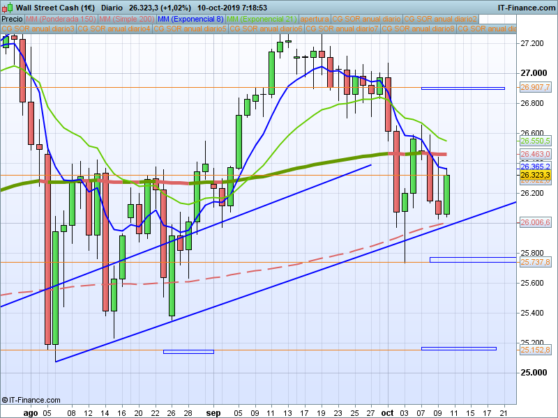 Continúan los mercados bailando al son de los rumores y comentarios procedentes del enfrentamiento entre China y EE.UU. Al final de la jornada de ayer, jarro de agua fría (una vez más) para aquellos que pensaban que saldría algo positivo de todo esto. Seguramente hoy leeremos sobre la posibilidad de llegar a un acuerdo en la próxima reunión entre estas dos potencias (¿cuantas van ya?). Vamos a nuestros gráficos, hoy le toca el turno al Dow Jones.