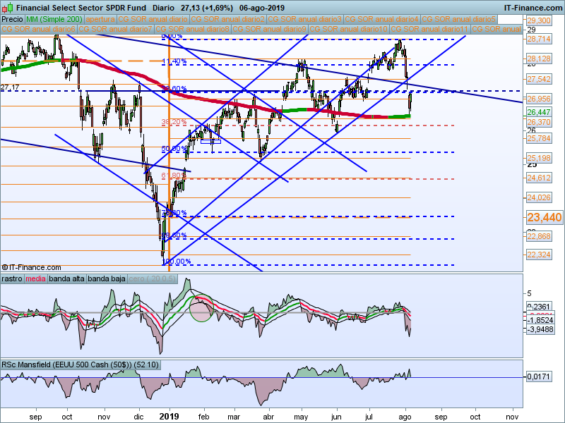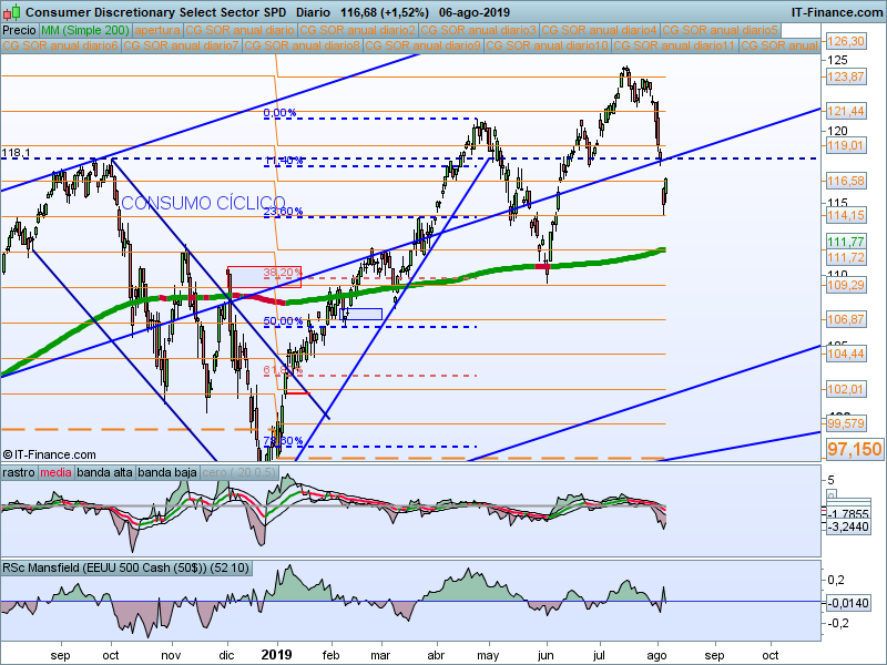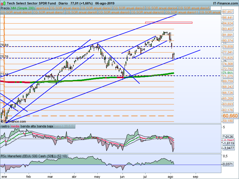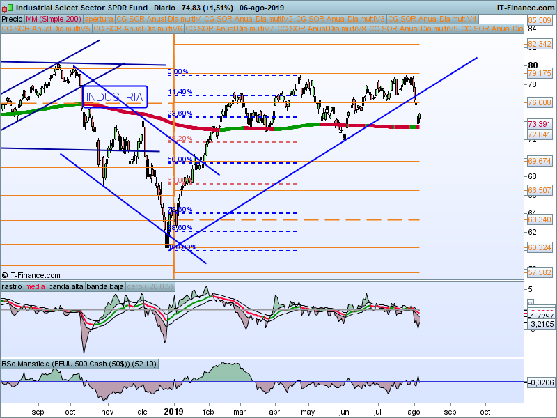 Otro sector que tras hacer un nuevo máximo anual en el SOR 79.17 se giró bruscamente hasta alcanzar la media de 200 sesiones. Importante ver el comportamiento en este punto. Dentro de este año, cada vez que se ha visitado a resultado ser un soporte consistente.