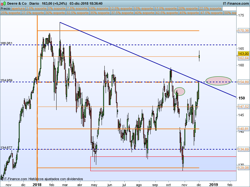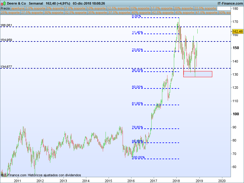 Deere.-Ha tenido un comportamiento muy técnico marcando muy bien los SORs anuales durante el 2018. El precio cayó en octubre hasta el segundo SOR de nivel 1 anual (los más gruesos), en lo que parece una estructura correctiva completa en ABC con final en el retroceso del 38.2% del impulso iniciado en 2016 lo que nos hace pensar en final de una corrección de grado mayor. Se trazó una 0B y fue perforada con un importante GAP alcista a la altura del precio de apertura anual (154.89), a la vez que se quebraba la estructura alcista al romper el último máximo relevante. Sería interesante coger este activo en la próxima corrección y el PAA pensamos que puede ser una muy buena opción.