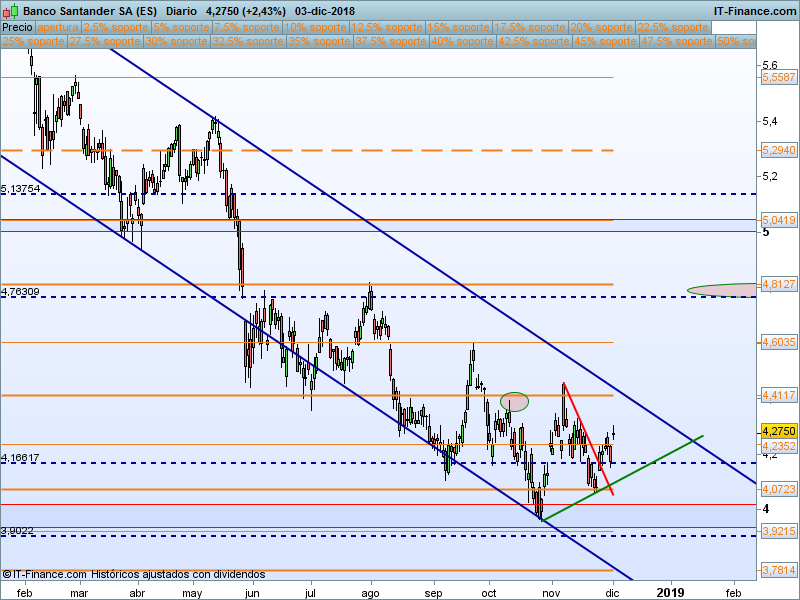 Santander.- Y vamos a intentar plantear una operativa dentro de una corrección mayor, en este caso en banco santander. El precio hizo un mínimo a finales de Octubre por debajo de los 4€ en zona de retroceso del 61.8% del impulso alcista que se inició en julio de 2016. Desde ese punto inició un rebote hasta el SOR anual 4.41, rompiendo el último máximo relevante. El SOR anual 4.07 le ha vuelto a dar apoyo. mientras permanezcamos por encima de este nivel podemos adoptar predisposición alcista hasta un objetivo inicial de 4.75-4.80 donde confluyen un SOR anual de nivel 1 y un refugio histórico. Un cierre por encima de 4.41 nos confirma el camino. Cierres por debajo de 4.07 nos predisponen a buscar la zona del 3.78.