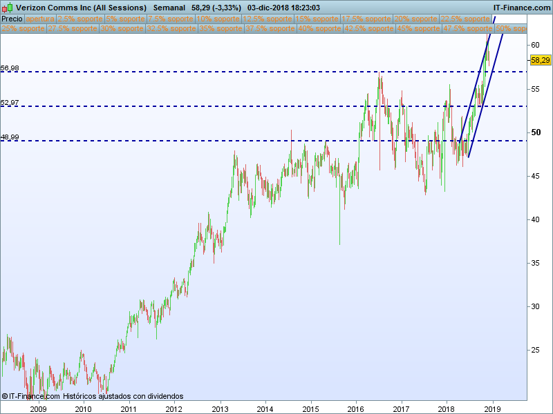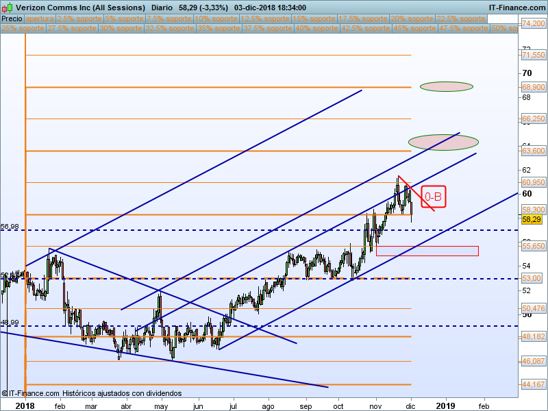 Verizon.- Caso de subida libre en donde cobran mayor importancia los SORs calculados. Tras esta breve corrección, en caso de rotura de la 0B podríamos incorporarnos al tramo alcista con objetivos SOR 63.60 y 68.90 en extensión. En caso de que la corrección continuase y perdiésemos el SOR 55.65, invalidaríamos esta posibilidad.