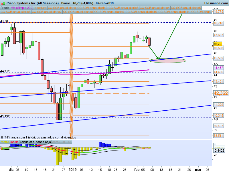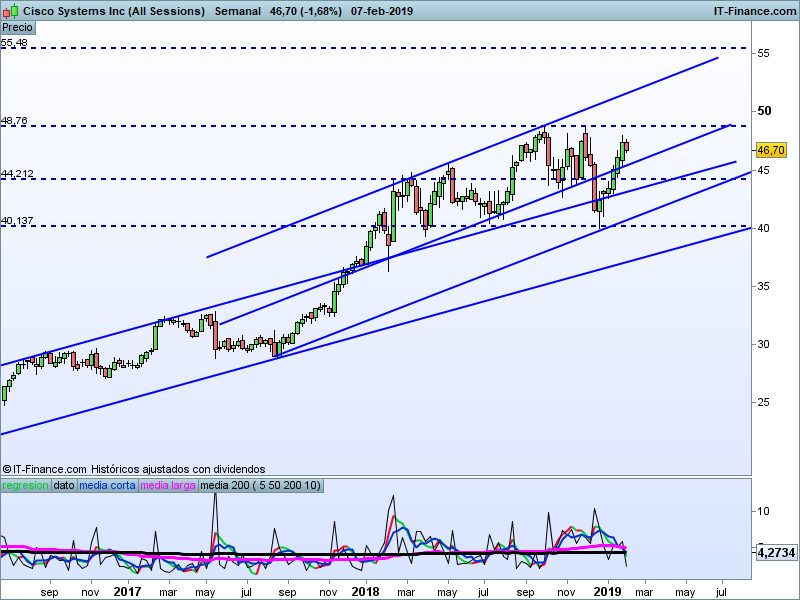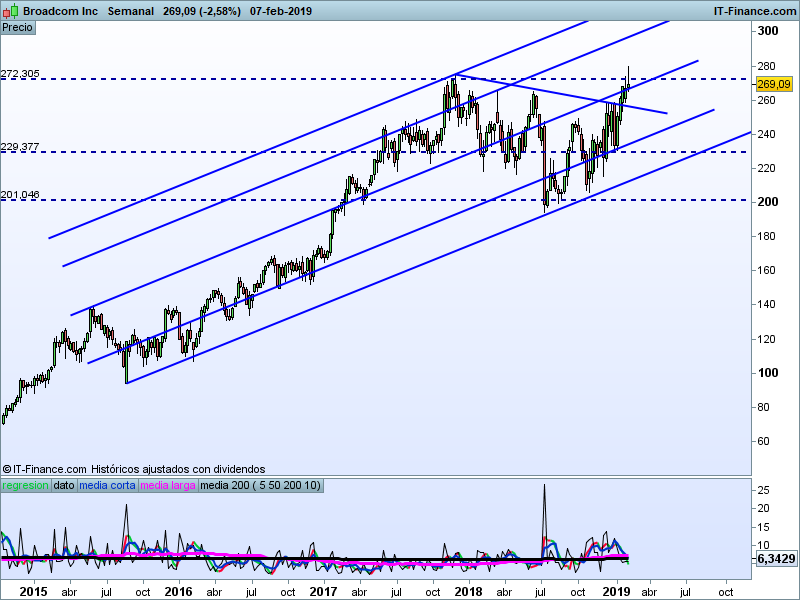 Cambiamos de sector y nos vamos a tecnología. La figura viene a ser muy similar a la que tenemos en el activo anterior. En gráfico semanal estamos por debajo de la resistencia que viene marc