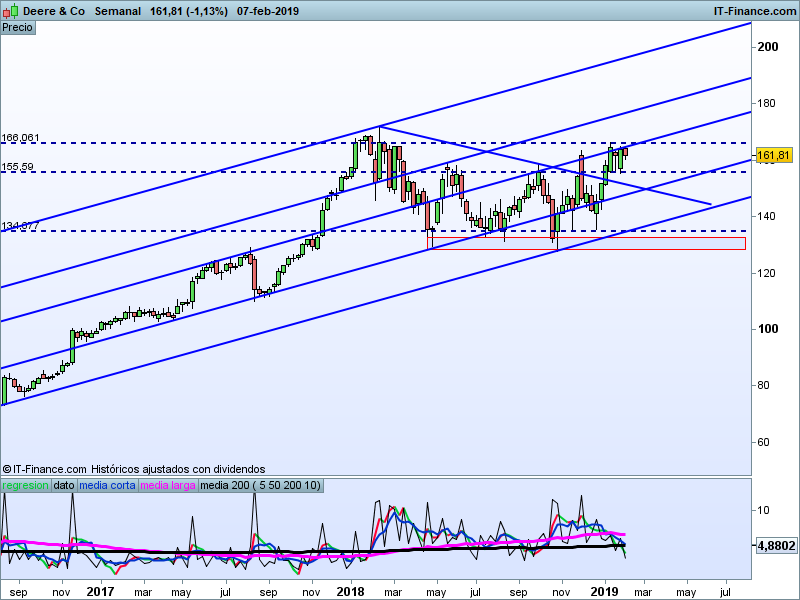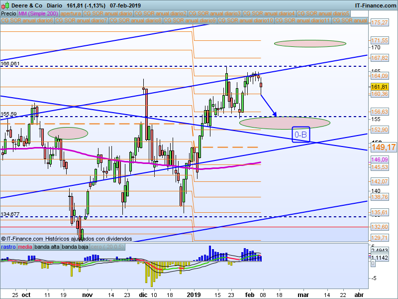 En gráficos semanales vemos como estamos realmente cerca de los máximos históricos. A corto plazo el SOR 164 ha cortado el paso en dos ocasiones, pensamos que podemos estar en la formación de una onda 4 y por tanto vamos a esperar al precio en la zona 152-155 para esperar patrones de giro que nos permitan incorporarnos a un nuevo tramos al alza.