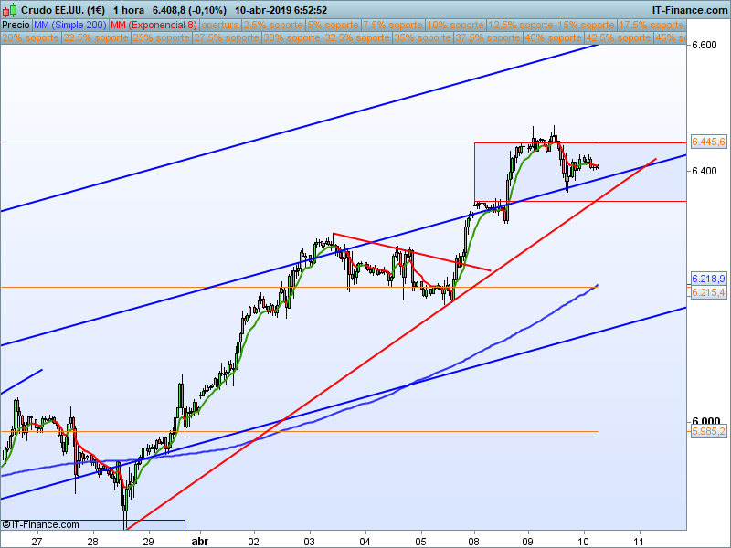 De momento estamos teniendo un ligero rechazo en la zona del SOR 6445. La ruptura de la LT marcada en rojo puede darnos un movimiento bajista hasta el SOR 6215, lugar en donde hemos marcado el punto de reversión.