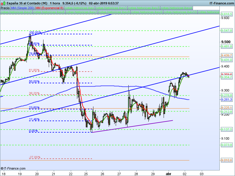 Hemos alcanzado el 61.8 de retroceso del anterior impulso bajista, vamos a ver que comportamiento tiene el precio en ese punto. Por encima del refugio 9355 debemos seguir manteniendo predisposición alcista en buscad del SOR 9439, por debajo, el SOR 9225 marca de neuvo el camino bajista.