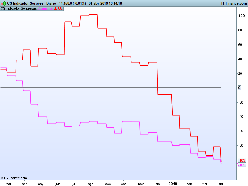 En el día de ayer publicamos nuestro indicador de sorpresas, aquí traemos las lecturas de EE.UU (en rojo) y de Alemania. Como vemos el excelente trimestre que hemos tenido en Estados Unidos contrasta con el debilitamiento cada vez más acentuado de su economía. Al final va a resultar cierto ese dicho de cuanto peor, mejor para las bolsas.