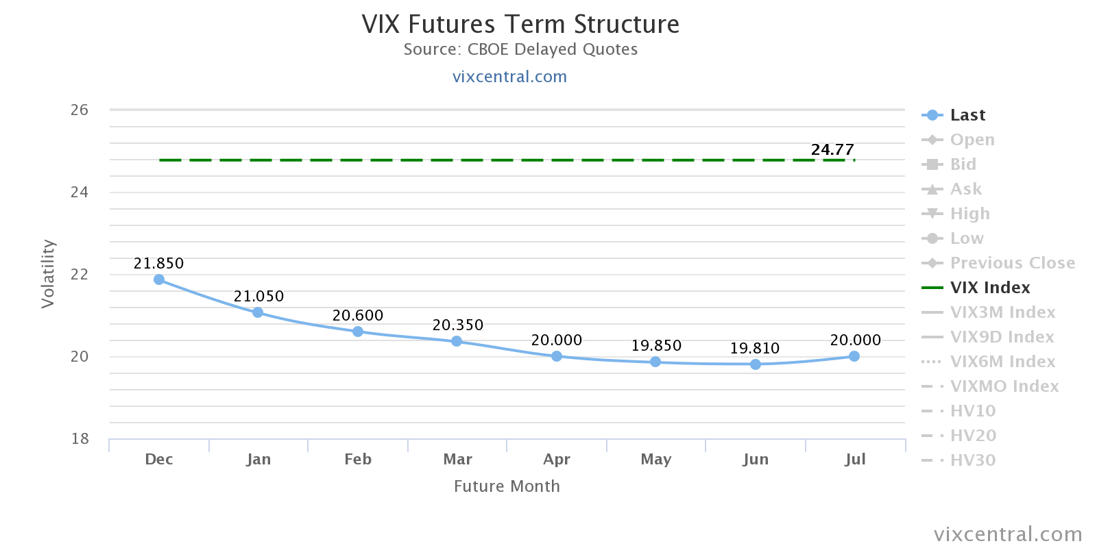 Aquí lo dejamos recién capturado con una lectura por encima de 24 manteniendo la curva de futuros clara pendiente negativa. No es una lectura extrema pero está lejos de los niveles que aportan tranquilidad a los mercados.