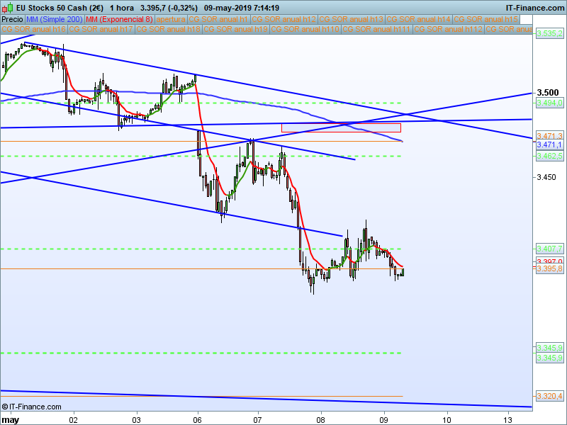 Mantenemos el comentario de ayer. Alcanzado el objetivo 3395, ahora debemos ver el comportamiento del precio. Cierres por debajo implican seguir avanzando hasta el SOR 3320