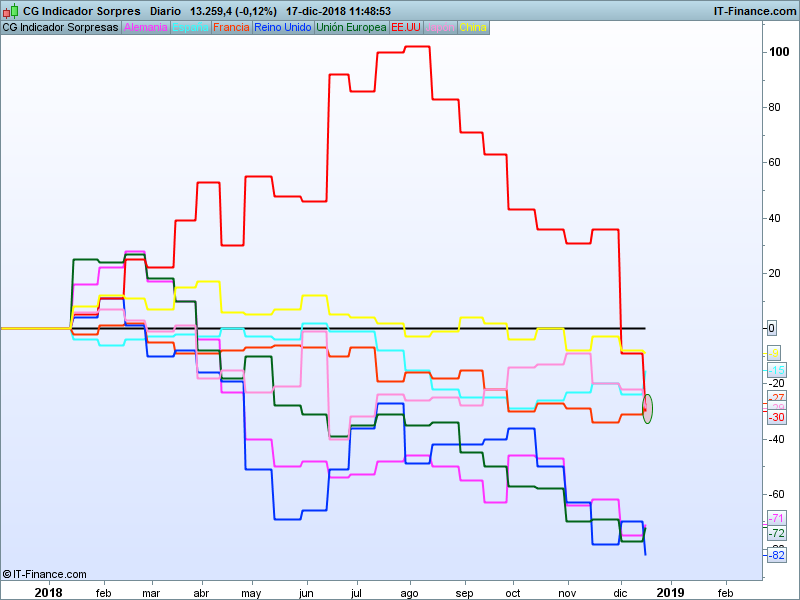 Indicador de sorpresas.- El WOW indicator, o lo que es lo mismo, nuestro indicador de sorpresas macro, que mide la desviación de los datos publicados respecto a los esperado por el consenso, nos confirma una semana más la debilidad que viene mostrando en los últimos meses la principal economía mundial. Si hace 15 días entramos por primera vez en el año en terreno negativo, la última actualización nos lleva a retroceder bastante por debajo de esta linea 0 que separa el bien del mal. Ninguna de las economías que seguimos presenta una tendencia positiva.
