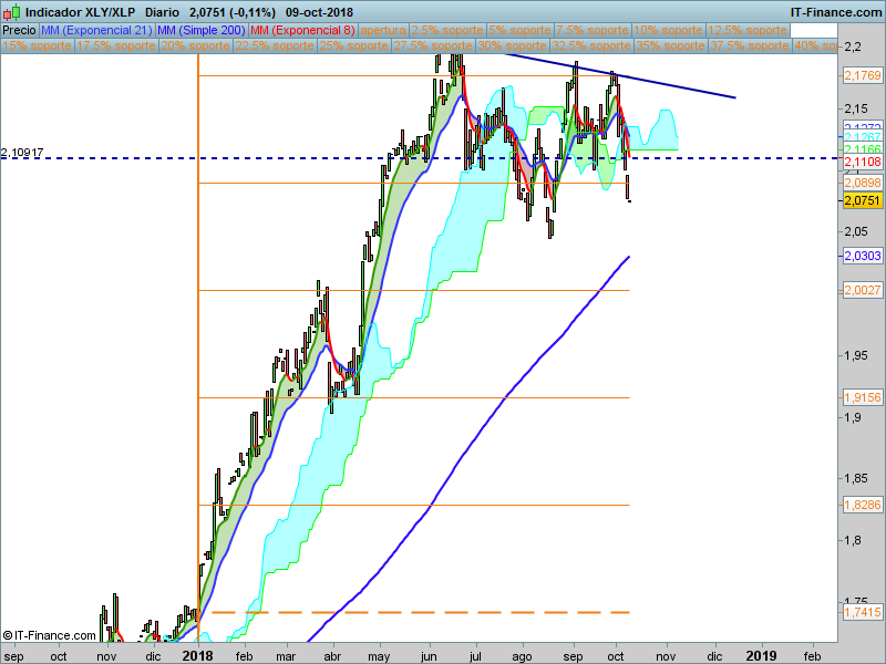 XLY/XLP.- Hemos estado viendo en los últimos meses como el spread XLY/XLP venia marcando una divergencia bajista (otra más) respecto a los índices americanos. En el gráfico que acompañamos vemos como el spread ha intentado por dos veces superar máximos de junio, sin exito. A muy corto plazo, la estructura alcista está dañada, con máximos y mínimos decrecientes. El filtro alcista que nos queda es la media de 200 sesiones, la pérdida de esta nos abriría la puerta a mayores caidas en el spread..