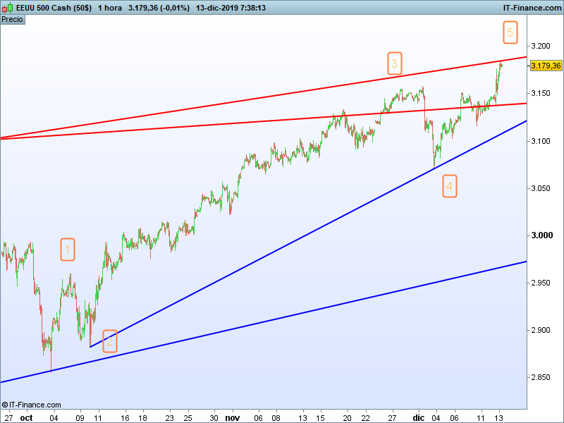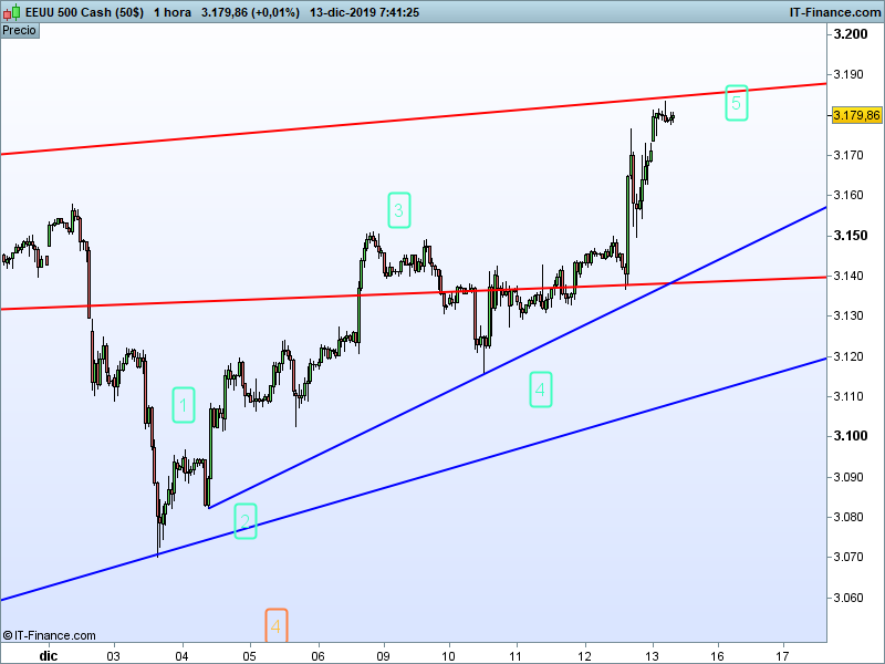 Retrocedamos por tanto hasta Octubre dentro de un gráfico horario, el que solemos adoptar como principal dentro de nuestra operativa de corto plazo. La historia se vuelve a repetir, vemos de nuevo como se despliegan 5 ondas, la última con arranque en el día 3 de Diciembre. Sería la 5 de 5 de 5 de 5 de 3.