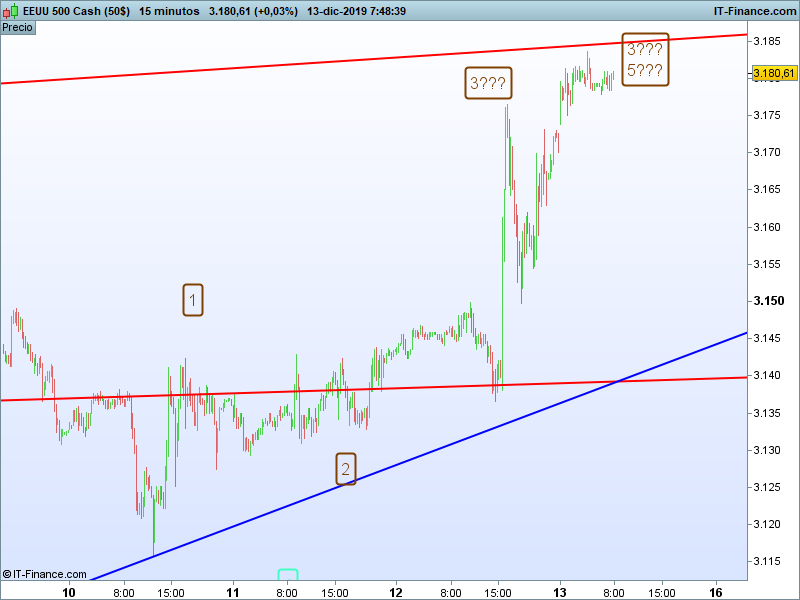 Llegamos pues al arranque frenético del mes de Diciembre para comprobar de nuevo que las estructuras en 5 ondas se siguen manteniendo, el último tirón alcista sería el que se produce el 10 de Diciembre. Estaríamos en la 5 de 5 de 5 de 5 de 5 de 3.