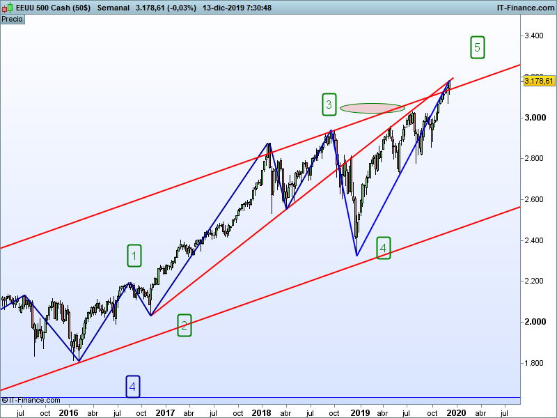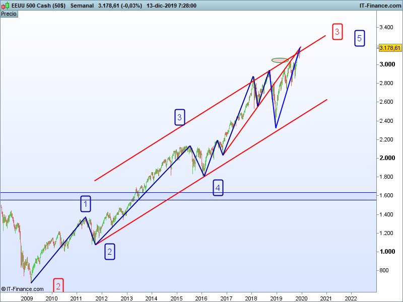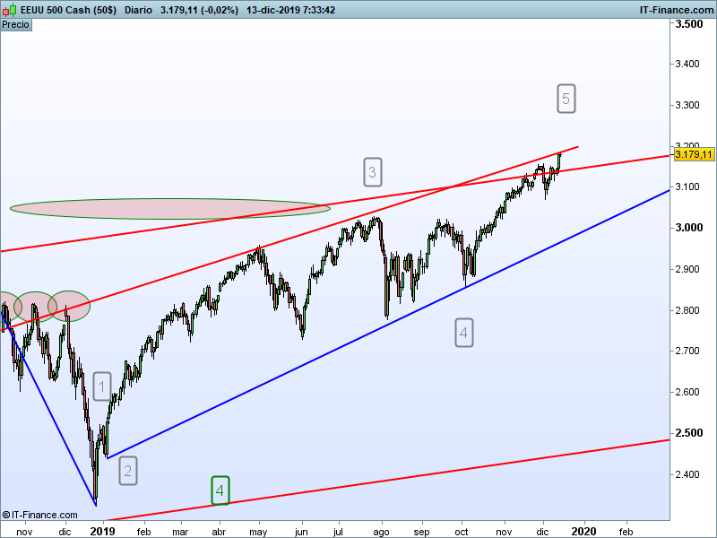 Otra vuelta de tuerca más en nuestro ejercicio de fractalidad, nos vamos a un gráfico diario para ver que es lo que ha pasado en esta última onda, desde principios de 2019. También vemos como estamos desplegando una secuencia de 5 ondas, la última iniciada en Octubre del presente, coincidiendo con la inyección de liquidez de la NoQE. Sería la 5 de 5 de 5 de 3.