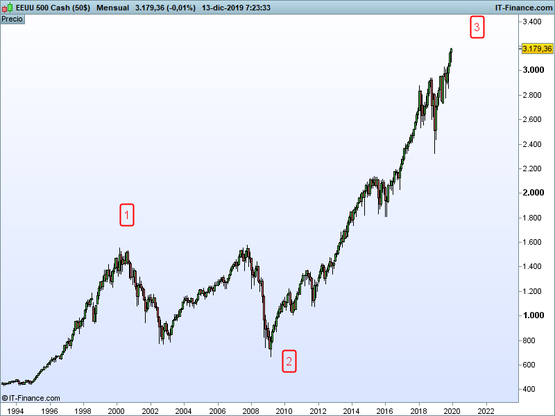Partiendo de un gráfico mensual, podríamos tener más o menos claro que la estructura de muy largo plazo que tenemos es esta. Donde el actual mercado alcista que se inició en el año 2009 parece haber desarrollado una cuasiperfecta onda 3.